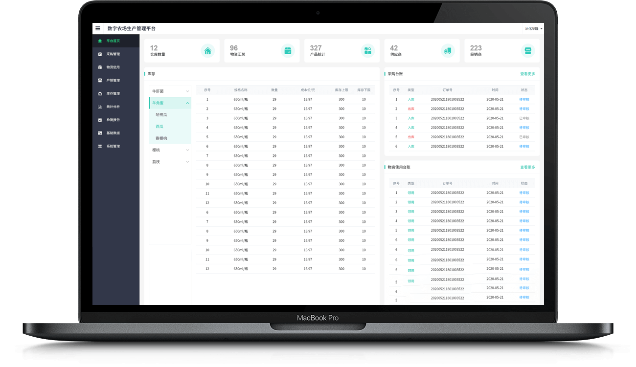 打通種植計(jì)劃 > 農(nóng)資采購(gòu) > 物資使用 > 產(chǎn)品采收 > 出庫(kù)銷售全業(yè)務(wù)流程,提升運(yùn)營(yíng)效率。
